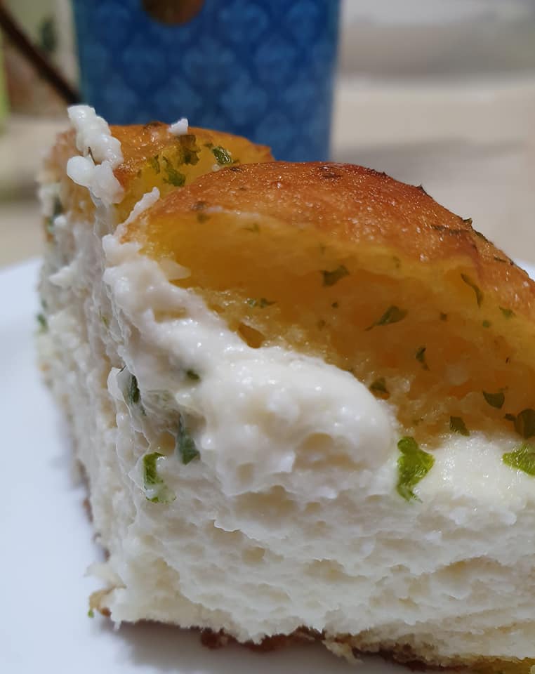 These Korean cream cheese garlic buns, each looking like a flower bud about to bloom, will surely make your day. The aroma/taste of butter and garlic blends well with the sweetened cream cheese generously piped in the buns. The cream cheese makes both sides of each segment feel a bit like custard that melts in the mouth. Ooh, what a lovely treat.