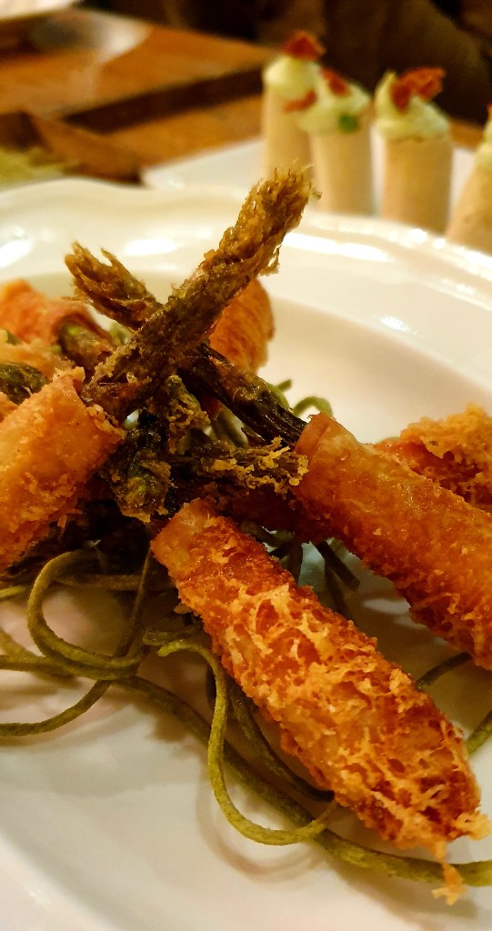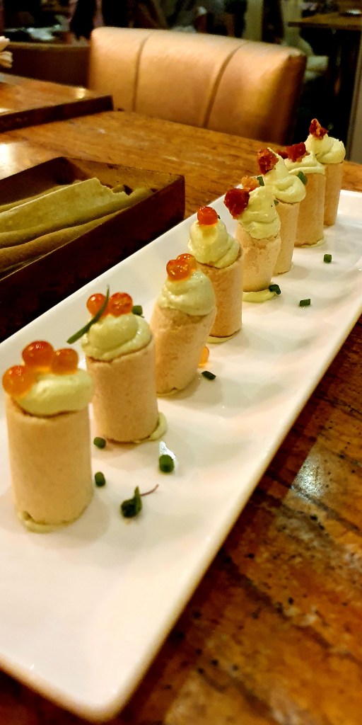 Barquillos Cylinders. Stuffed with chive mousse, and topped with salmon roe and prosciutto bits. The mousse is just slightly sweet, and blends well with salmon roe. The crunch makes it fun.