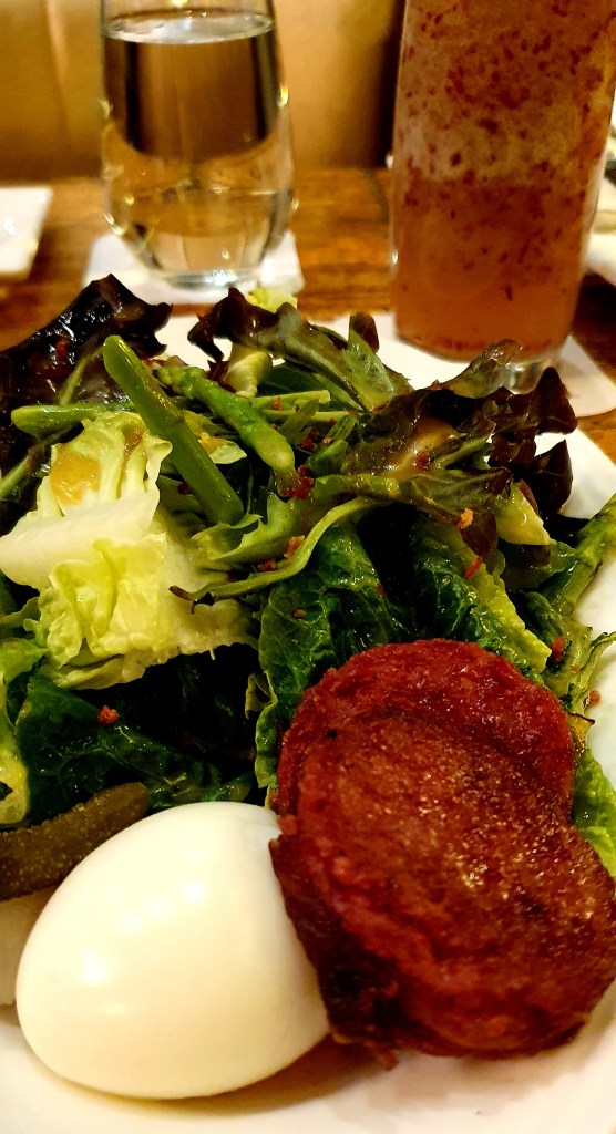 Cotechino Salad. With mustard glaze, Italian sausage, and soft-boiled egg. The sausage makes the difference. Otherwise, it’s the usual salad greens.